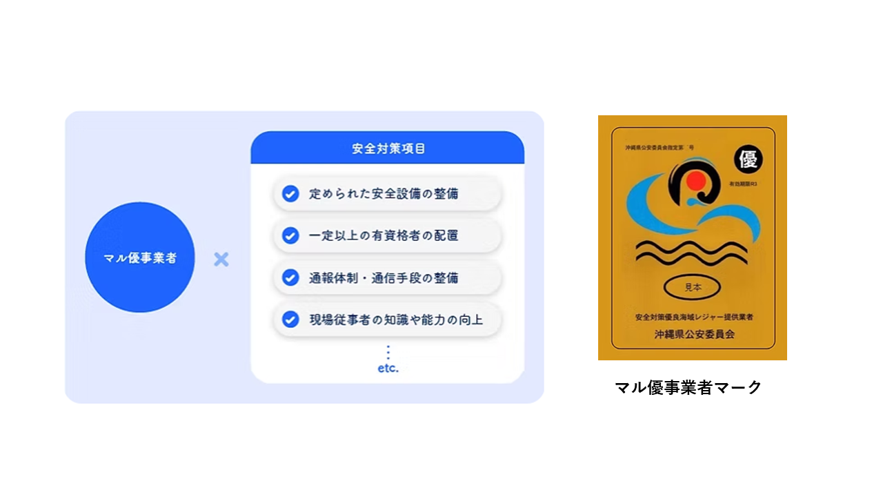 沖縄県内のマリンレジャーの安全基準認証制度「安全対策優良海域レジャー提供業者(マル優業者)」とは沖縄県には沖縄県公安委員会が、マリンレジャーを提供するために最低限必要な安全対策基準が満たされていると認めたマリンレジャー事業者を認定する制度があります。それが安全対策優良海域レジャー提供業者(マル優業者)です。